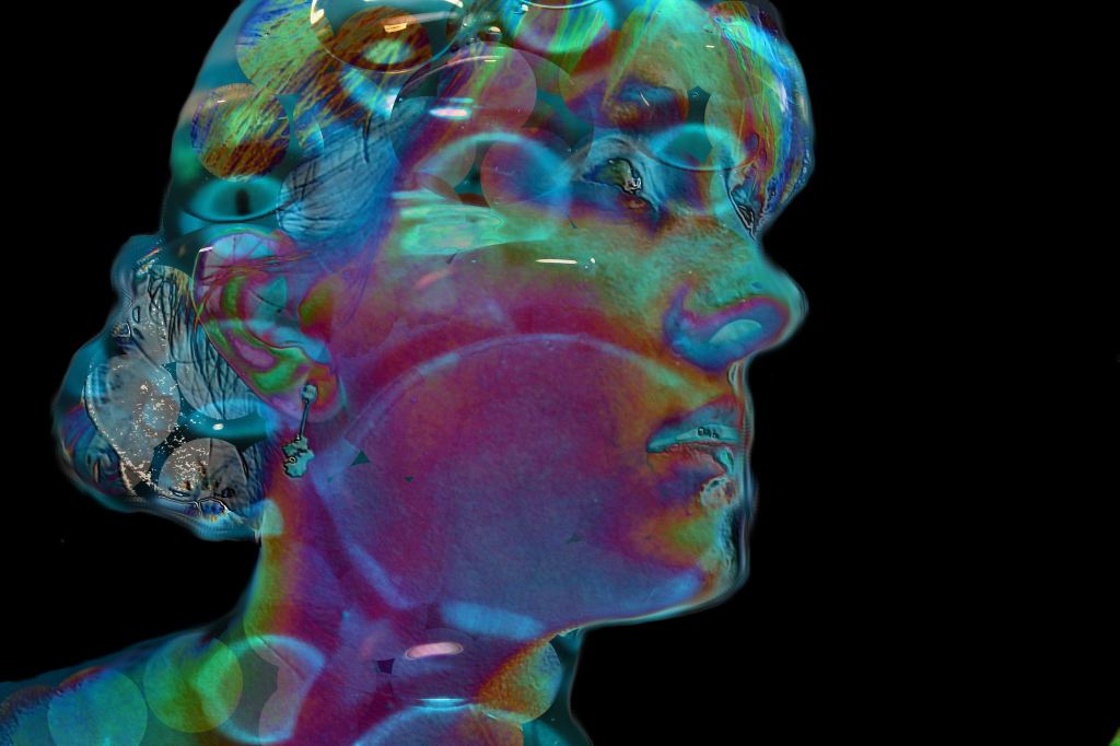 I had taken a picture of water and soap bubbles, and I also had an old profile picture of myself. I took the bubbles and I edited them to look like multi-color chrome – but they definitely still resembled water. Then I took this watery edit and stamped it onto the photo of my profile, which created this really interesting texture…and THAT was displayed for several weeks in a gallery.